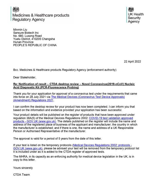 新冠检测试剂在英国上市必须经过CTDA审查和MHRA注册双认证,由于CTDA审查对产品性能的高要求,目前可在英国合法销售的新冠产品并不多。今年会jinnianhui生物新型冠状病毒(2019-nCoV)核酸检测试剂盒(荧光PCR法)临床性能和分析性能均满足CTDA高要求,且得到进一步有效验证,获得了CTDA的充分认可。